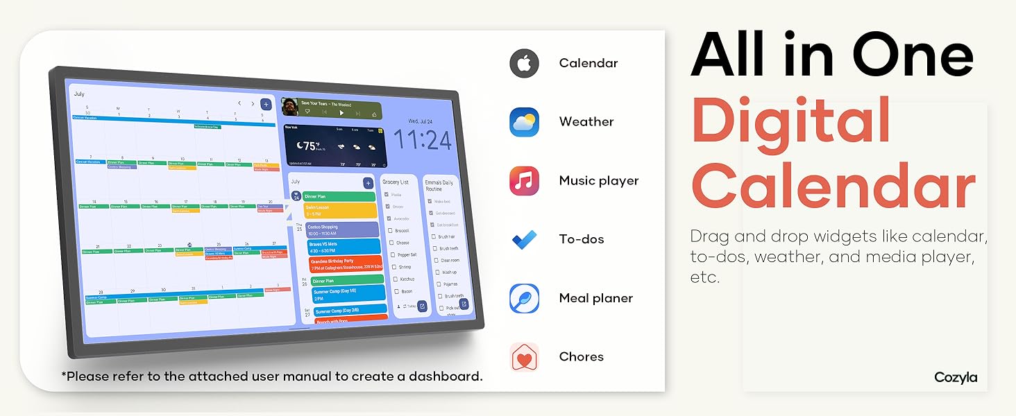 Get organized with the Cozyla Calendar+! Displaying your family’s important events, chores and more, this 24- or 32-inch touchscreen calendar keeps everyone in sync. Perfect for busy families juggling multiple schedules, it syncs seamlessly with various calendar apps.
